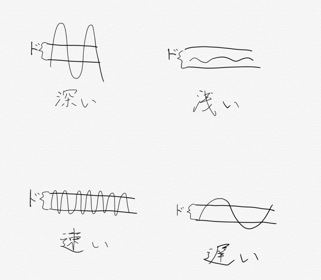 ビブラートの変化量を作り出す要素は、大きく分けて二つあります。1つ目は揺れの幅に着目したもの、もう1つは揺れの速さに着目したものです。