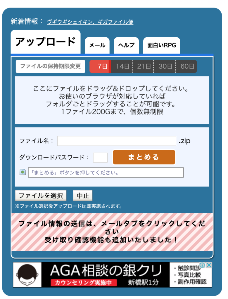 画面はこんな感じ。実際に開くと広告かなり多めです。運営費をしっかり稼いでいただかないと困りますから、どんどん広告貼ってくださいギガファイル便さん!