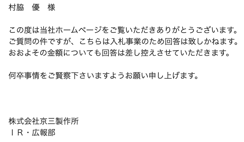 京三製作所さんにも問い合わせフォームから問い合わせてみました。ただ、ホームページに記載してないことは専門業者でもない限り教えてくれないのではないかと予想できます。