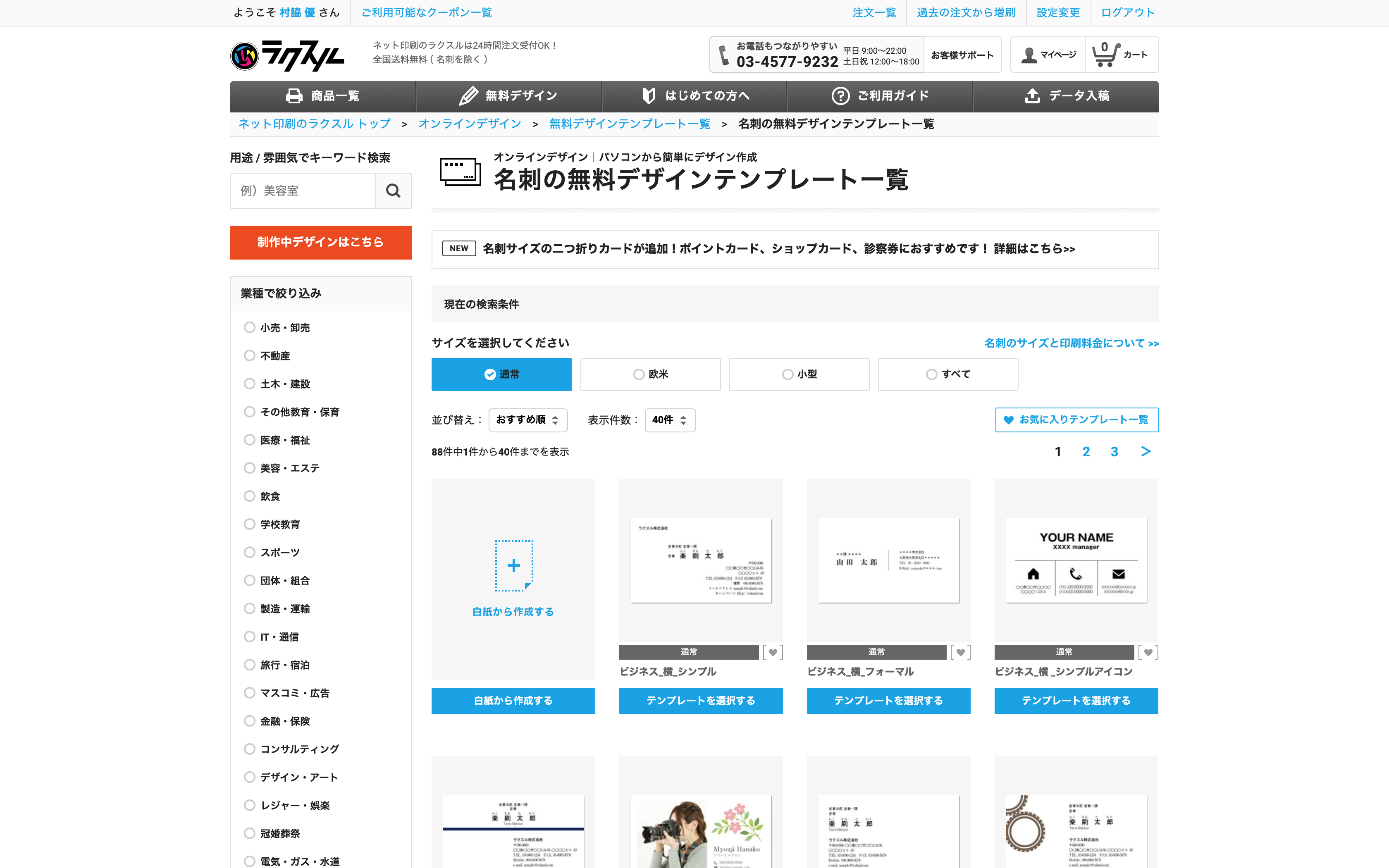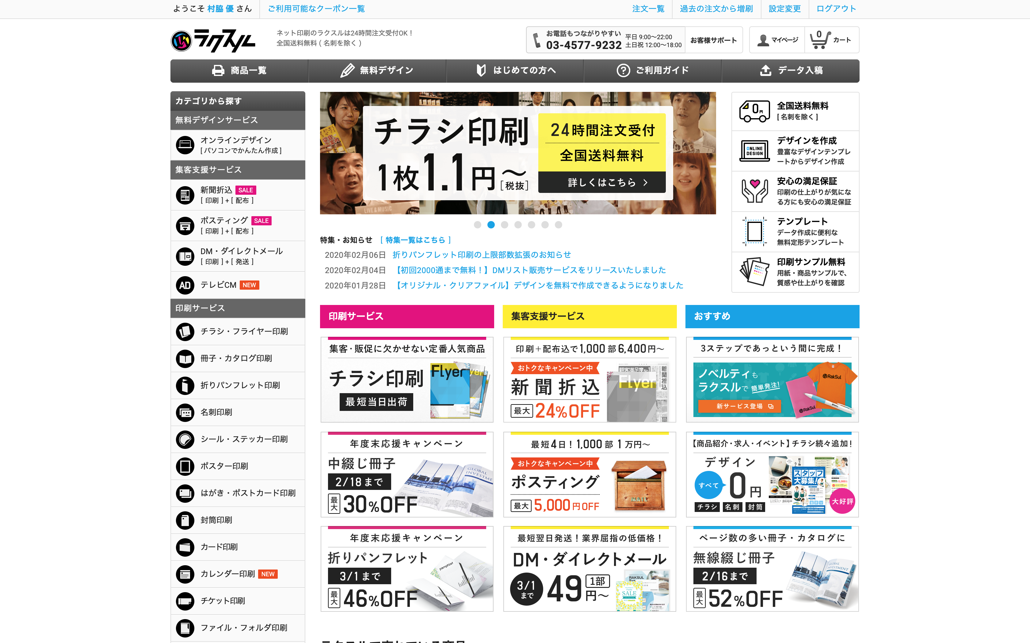 まずは「ラクスル」のアカウントを作りましょう。アカウント作りは簡単です。ログインするとこのような画面になります。ログインしなくてもこんな感じかw