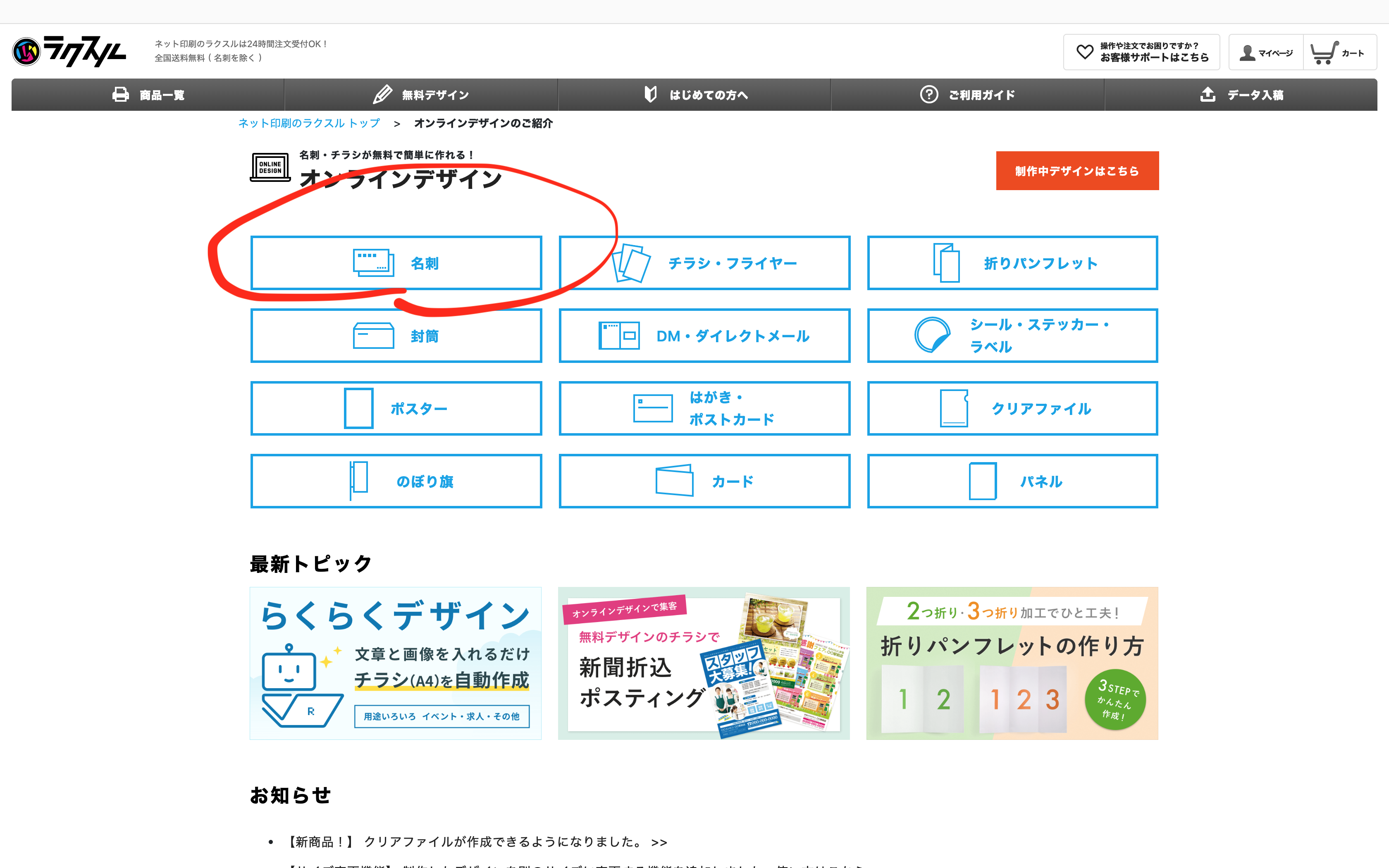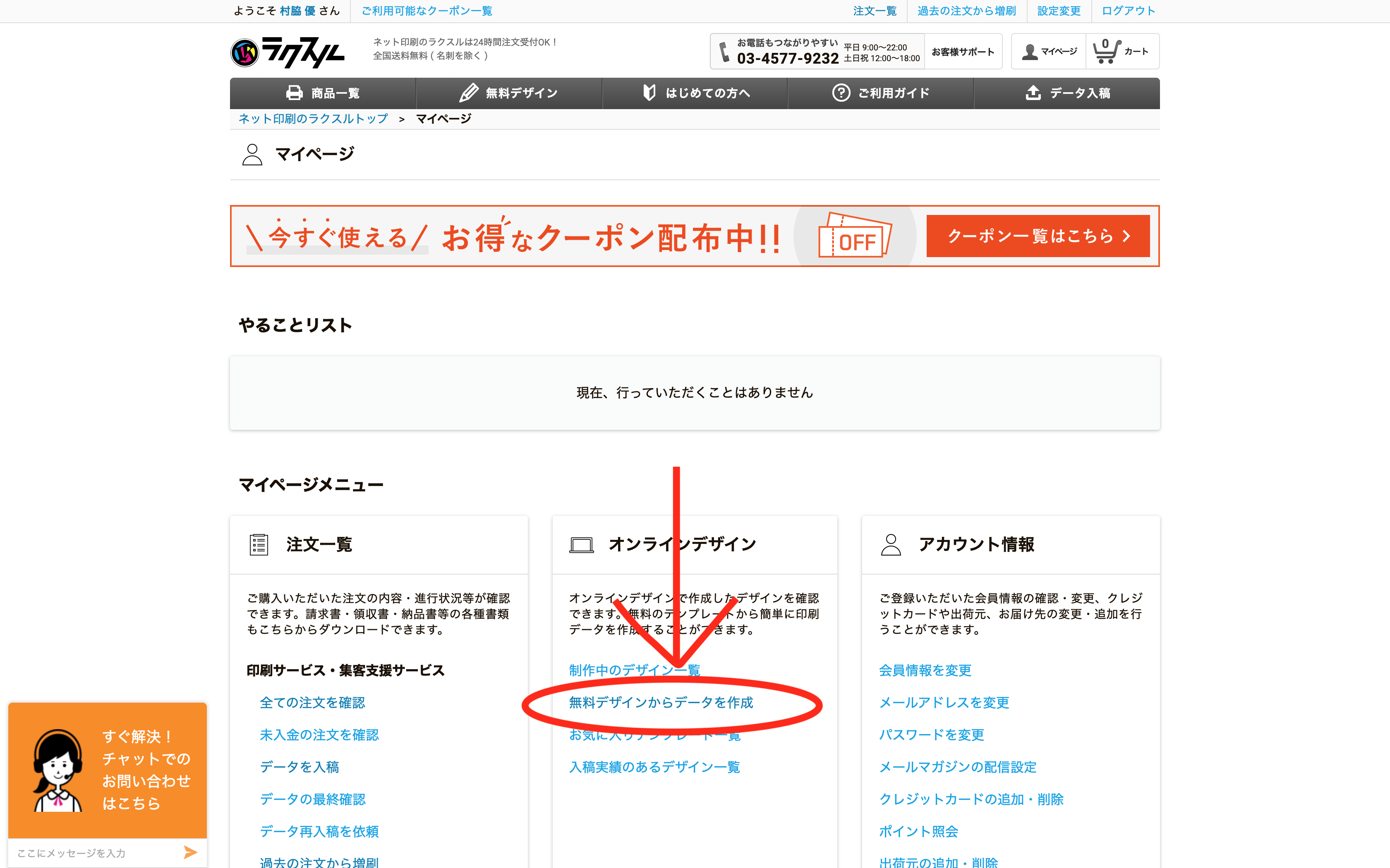 画面右上の「マイページ」をクリックしてみましょう。そうすると「オンラインデザイン」の項目が出現します。その中の「無料デザインからデータを作成」をクリックしてくださいな。