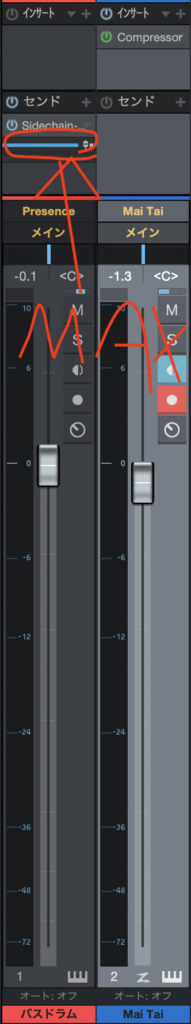 サイドチェーンとは、エフェクトのかかり具合を他のトラックの入力によってコントロールする方法です。