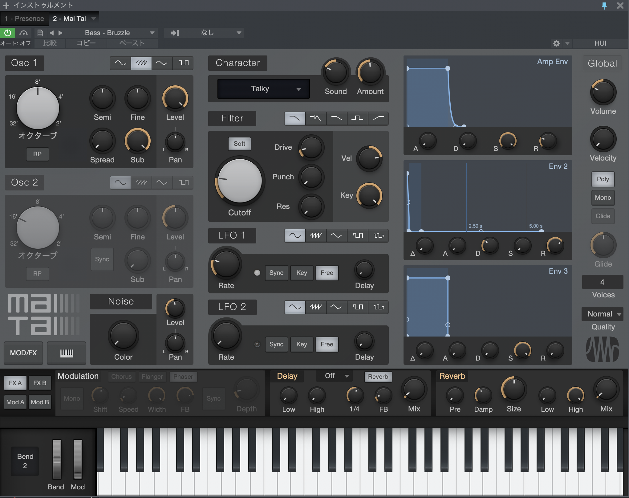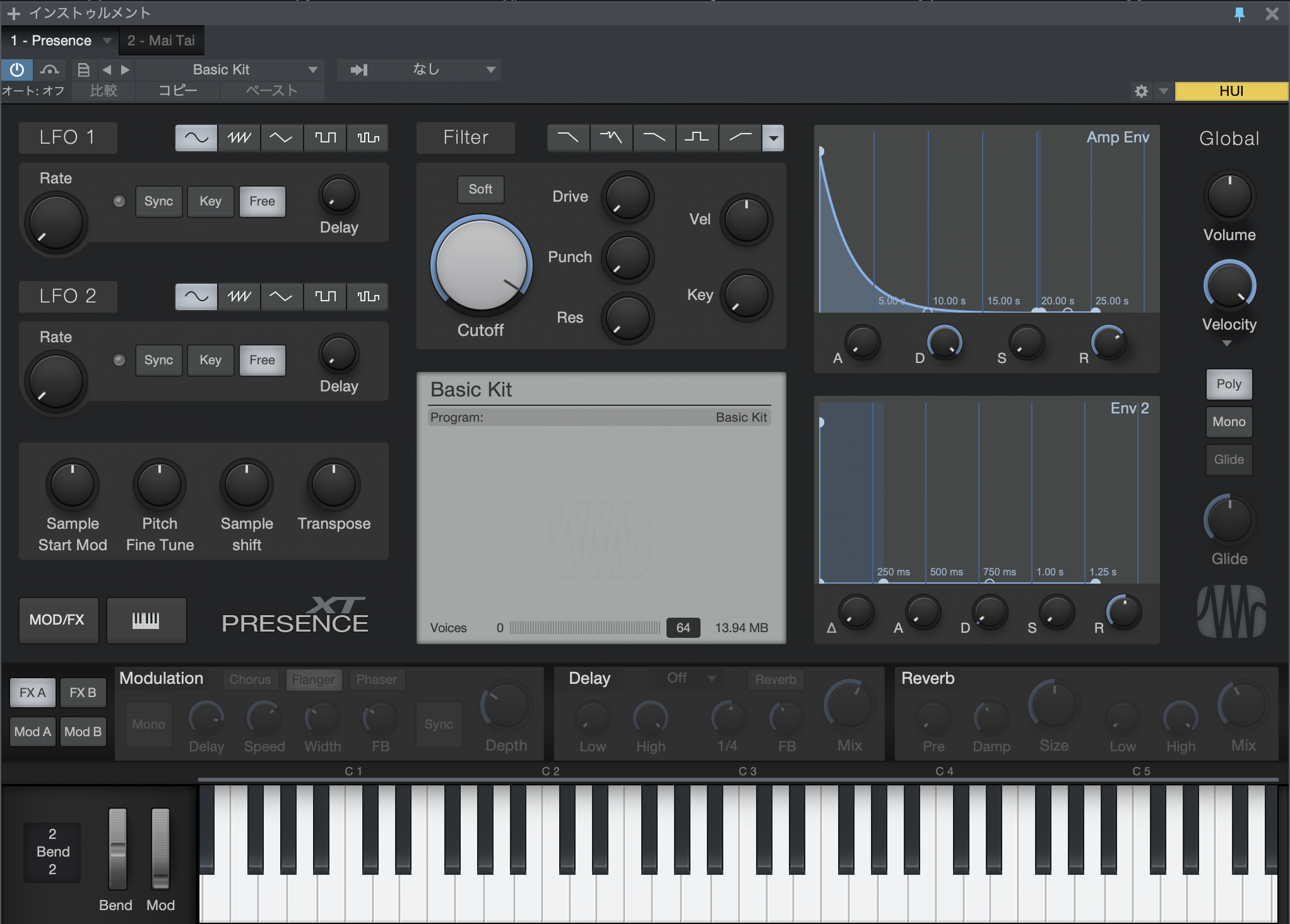 純正音源「Presence」のドラム音源「Bssic Kit」と、純正シンセサイザー「Mai Tai」のベースプリセット「Bass – Bruzzie」です。