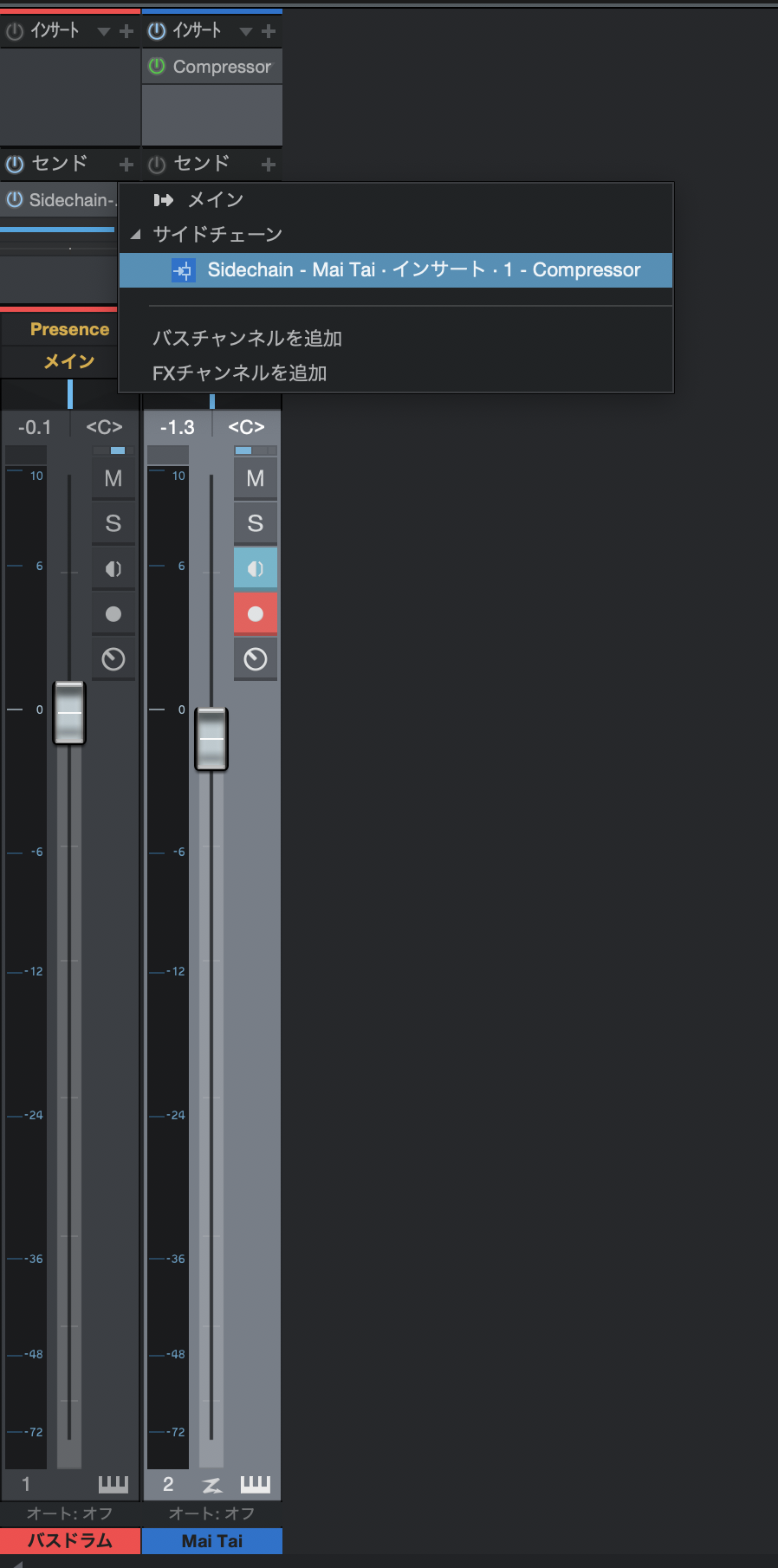 バスドラの「センド」の項目から「サイドチェーン」を選択、バスドラムの「コンプレッサー」を選択してください。