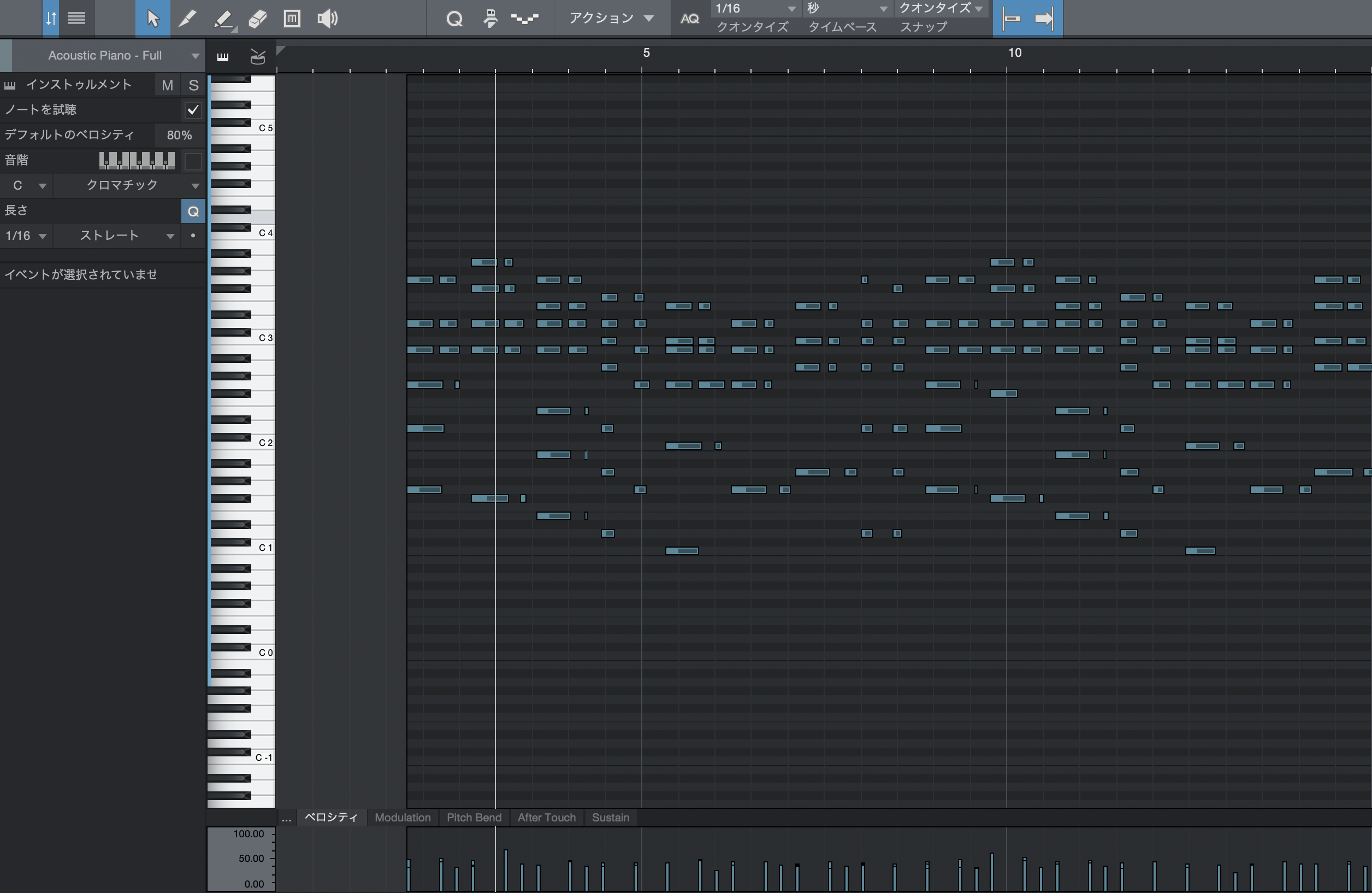 ↑こんな感じです。打ち込んであるノートは16分音符ベースで打ち込んでありますが、上のグリッドの基準となるバーの数値が音符の頭と全然会っていませんね。