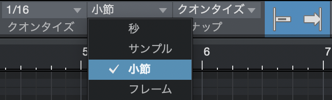 スタジオワンの上の方にあるところと、右下の「編集」を押してノートを開いた状態のところの2箇所があります。どちらも「小節」に設定しましょう!