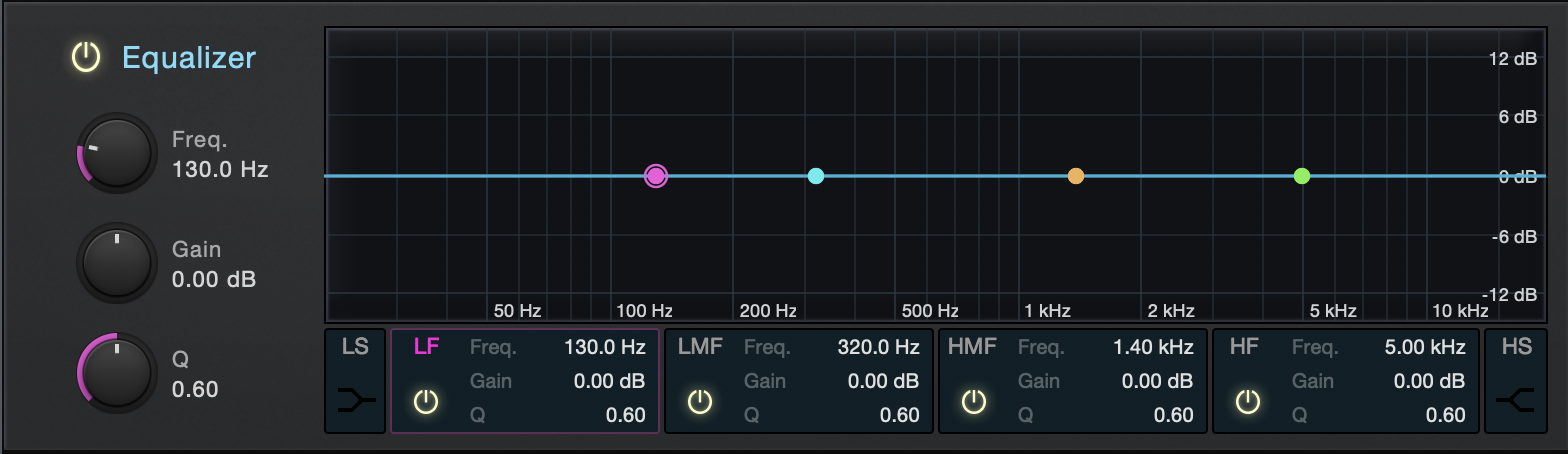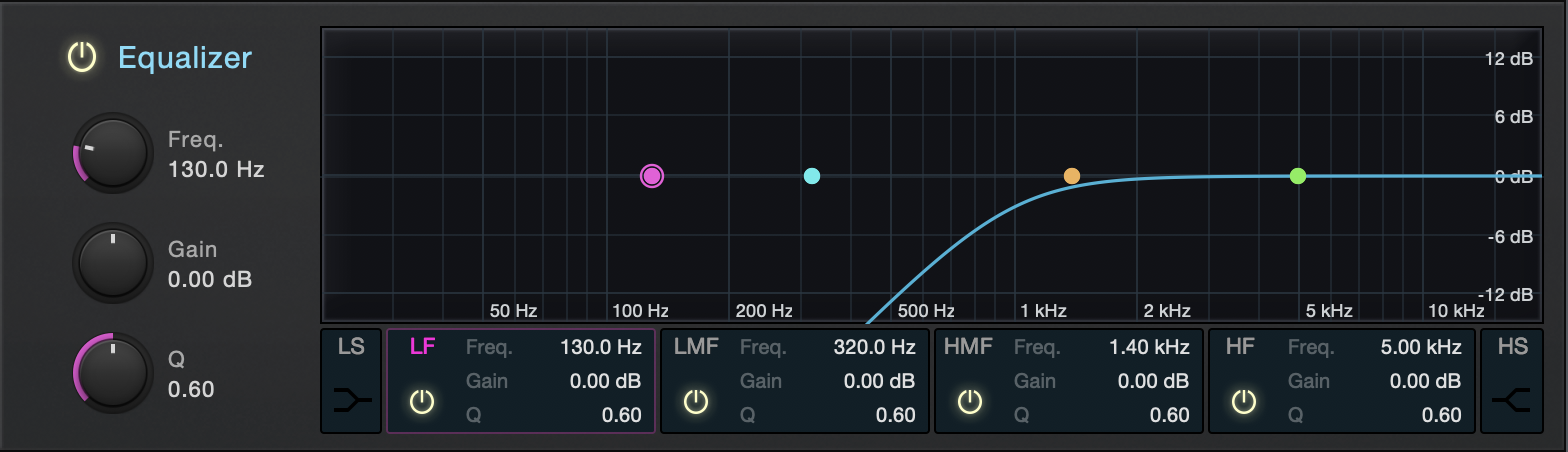 色の着いた点の1としたの「LF」「LMF」「HMF」「HF」がリンクしています。現在は「LF」が選択されているので、左のつまみもピンク色になっています。このつまみを触ると、グラフ状のピンクの点が移動し効果がでます。