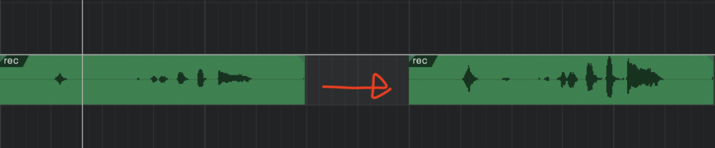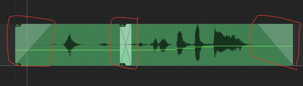 真ん中の重なっているところはクロスフェードさせて、つなぎ目がわからないようにしましょう。ショートカットは二つのテイクを選択して「X」です。