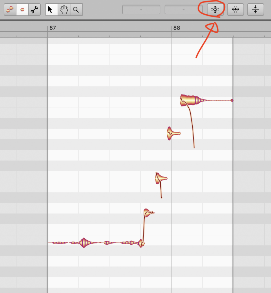 まずは頭の部分ですが、レコーディングをするときに歌い出しの1小節くらい前から録音を開始すると重ますが、その無音の部分をカットしてフェードインさせます。