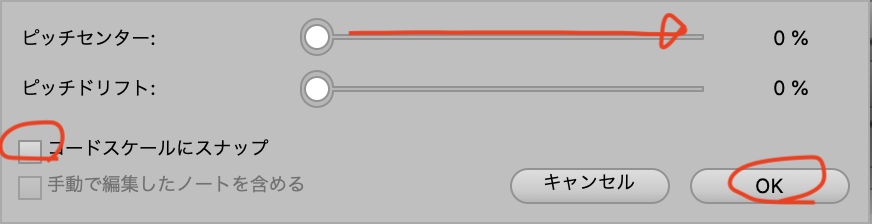 それから、それぞれのバーをいじってチェックつけたりつけなかったりして、「OK」を押して大まかな補正は完了です。