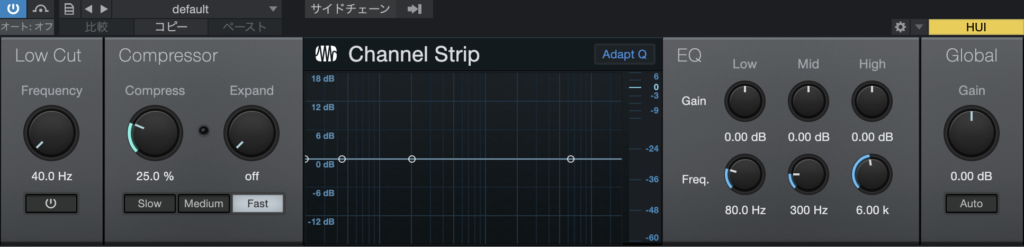 コンプとEQは「Channel Strip」にまとめて入っています。