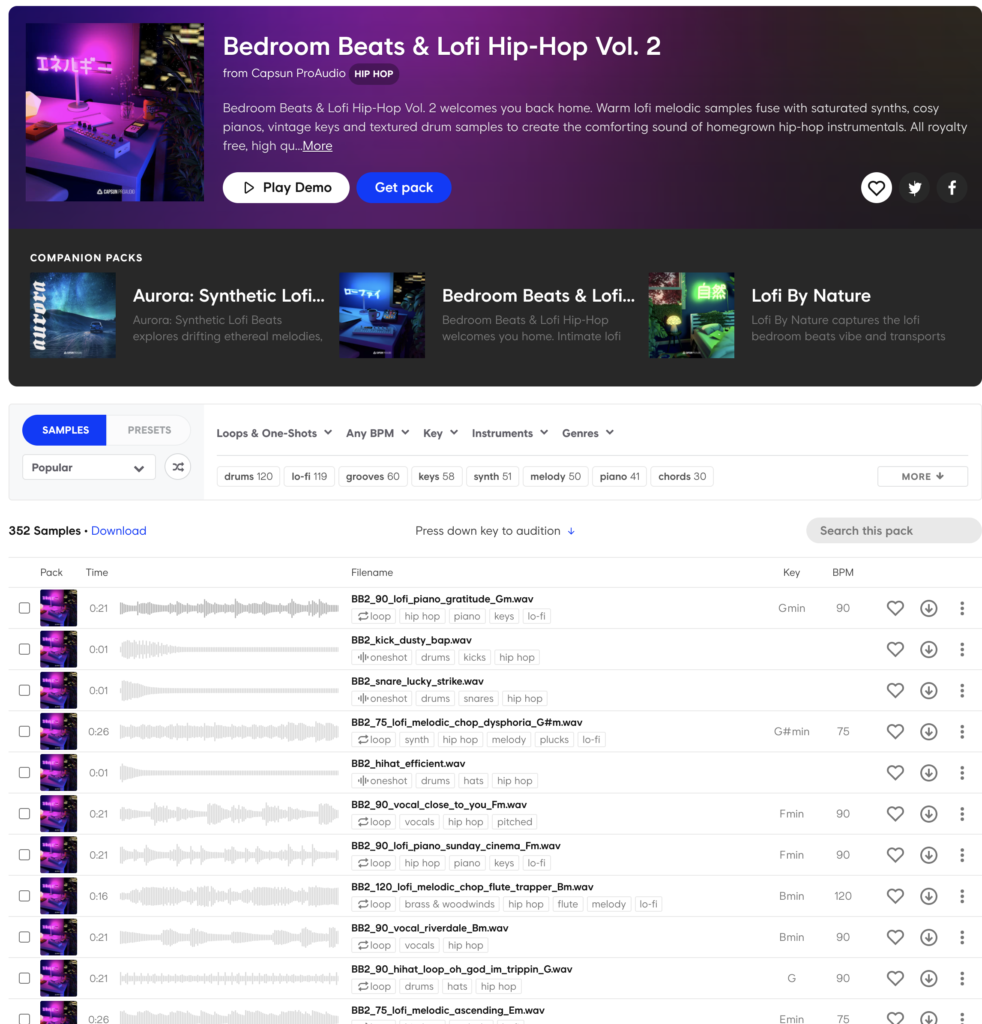 またこのサンプルパックで作った楽曲を「Play Demo」をクリックで視聴することができます。