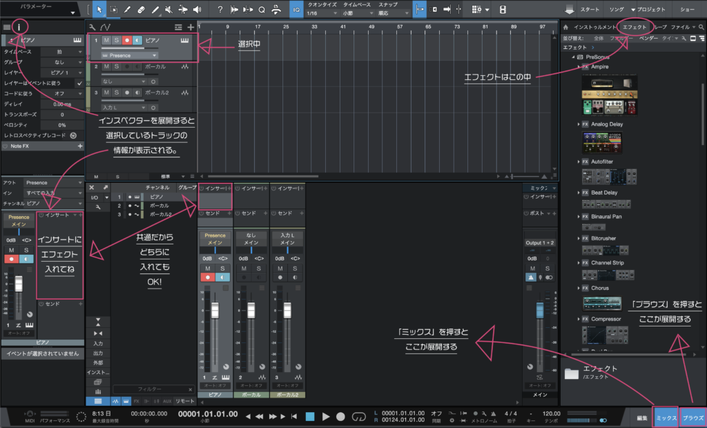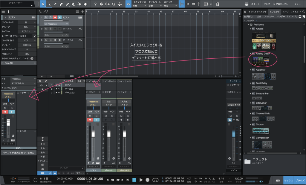 今回のテーマは[st-marumozi fontawesome=”” bgcolor=”#f3f3f3″ bordercolor=”” color=”#000000″ radius=”30″ margin=”0 10px 0 0″ myclass=””]【StudioOne攻略】エフェクトを追加する方法[/st-marumozi]です!
