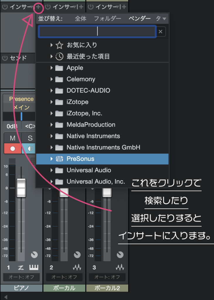 追加したいトラックの「インサート」にエフェクトを追加します。