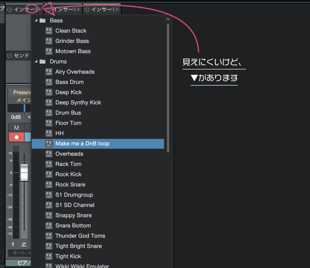 左上「i」のアイコン(インスペクター)か、右下「ミックス」のタブで展開し、エフェクトを入れたいトラックの右上の「+」を押します。